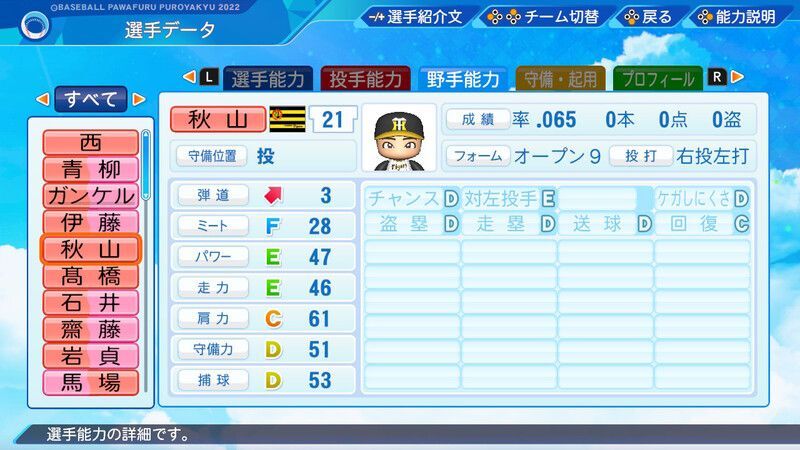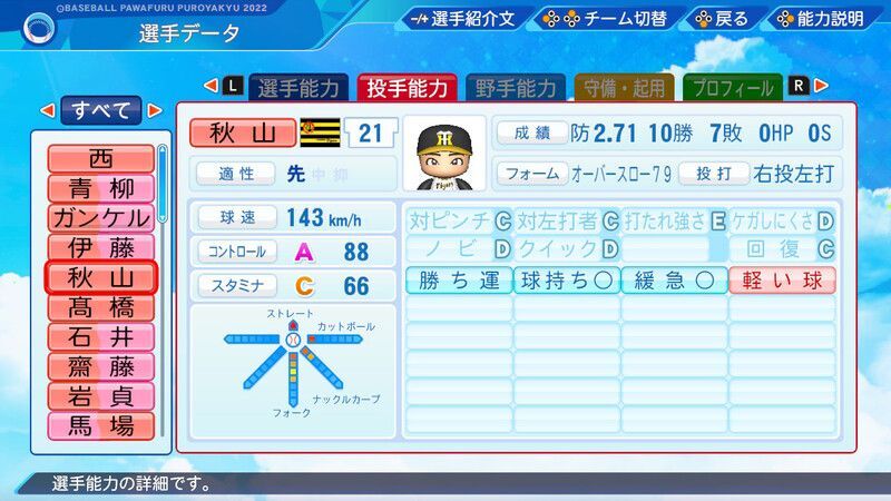 【パワプロ2022】秋山 拓巳の能力や特徴