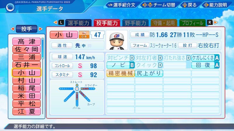 【パワプロ2022】小山 正明(・)選手の投手能力、野手能力、フォームや投打などの基本情報に加え、特殊能力などの選手データをまとめています