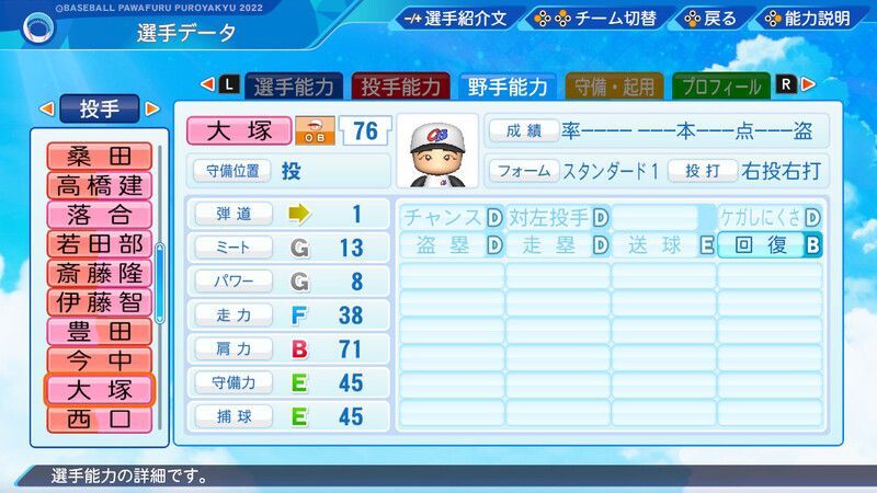 【パワプロ2022】大塚 晶文(・)選手の投手能力、野手能力、フォームや投打などの基本情報に加え、特殊能力などの選手データをまとめています