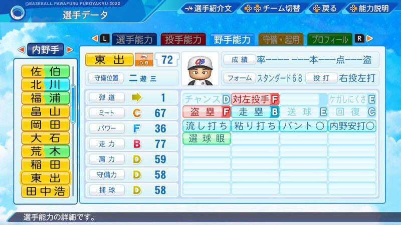 【パワプロ2022】東出 輝裕(・)選手の野手能力、フォームや投打などの基本情報、特殊能力などの選手データをまとめています