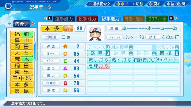 【パワプロ2022】本多 雄一(・)選手の野手能力、フォームや投打などの基本情報、特殊能力などの選手データをまとめています