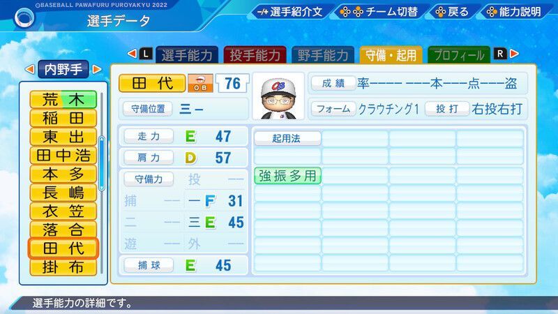 【パワプロ2022】田代 富雄(・)選手の野手能力、フォームや投打などの基本情報、特殊能力などの選手データをまとめています