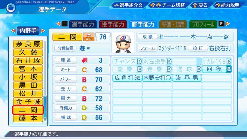 【パワプロ2022】二岡 智宏(・)選手の野手能力、フォームや投打などの基本情報、特殊能力などの選手データをまとめています