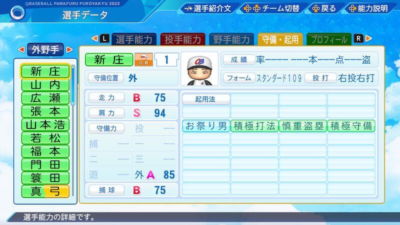 【パワプロ2022】新庄 剛志(・)選手の野手能力、フォームや投打などの基本情報、特殊能力などの選手データをまとめています