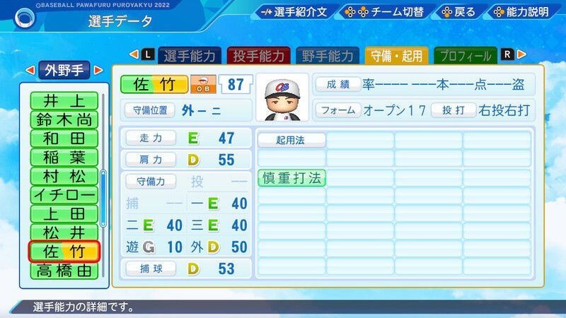 【パワプロ2022】佐竹 学(・)選手の野手能力、フォームや投打などの基本情報、特殊能力などの選手データをまとめています