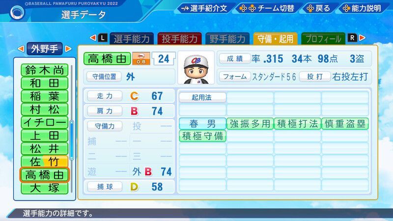 【パワプロ2022】高橋 由伸(・)選手の野手能力、フォームや投打などの基本情報、特殊能力などの選手データをまとめています