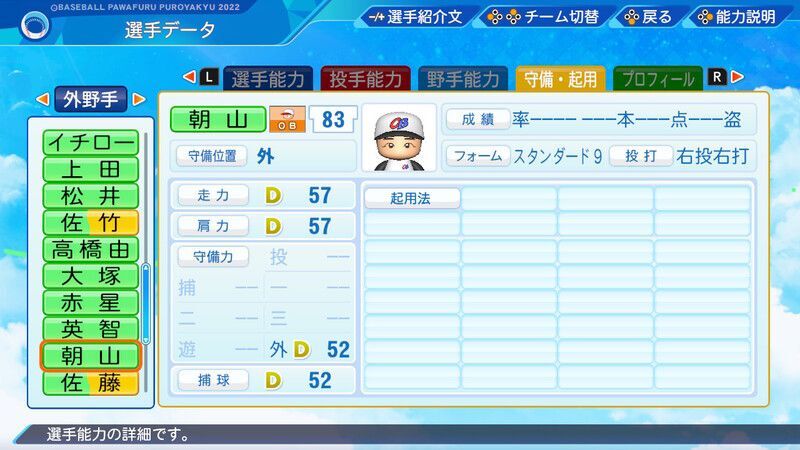 【パワプロ2022】朝山 東洋(・)選手の野手能力、フォームや投打などの基本情報、特殊能力などの選手データをまとめています
