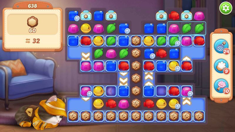 クッキー生成器から延々とクッキーが出てくる。中央寄りの生成器から出てくるクッキーは2回削らないと砕けないが、左右端寄りの生成器から出てくるクッキーは1回で削れる。