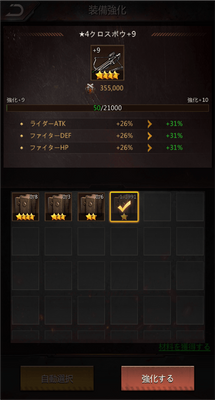 - 装備強化時に一つしか強化しないので迷いにくい。