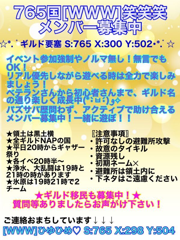 ・浄水等の開始は21時、その他は概ね21時30分か22時開始。・サブギルドあり。採集only。たまにスタパ用ギルドになります。・課金無課金問わず。ギルチャも自由です。よろしくお願いしますෆ˚*