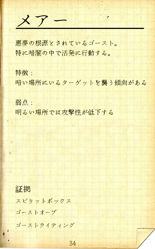 | メアーは暗闇を好むゴーストである。照明の状態によってハント正気度が変化し、照明オン時 40%、オフ時 60%でハント判定を行う。照明を点けることがなく、近くで照明をオンにした瞬間に即座にオフにする特殊能力を持つ。 | |