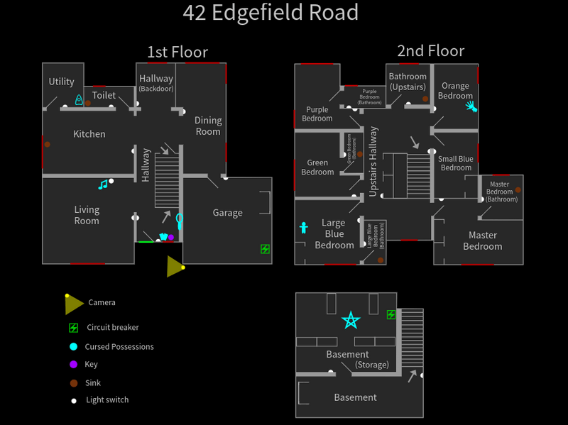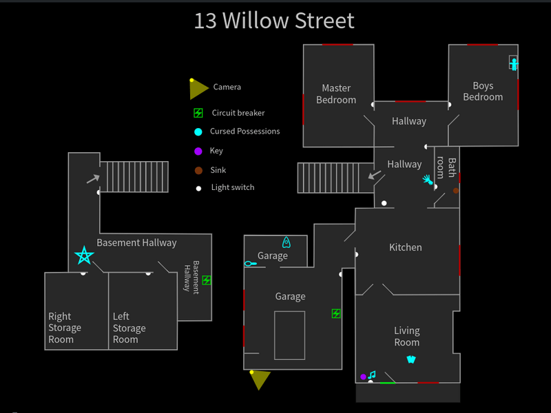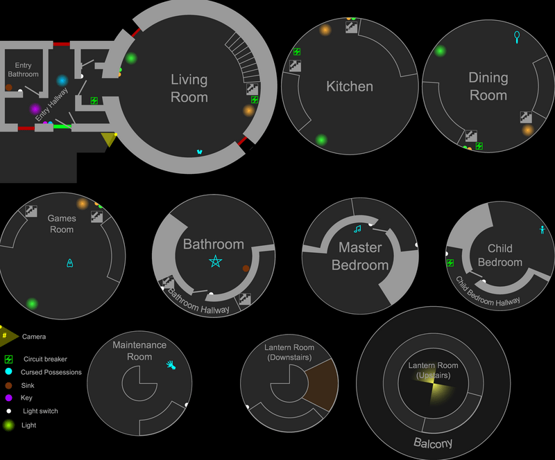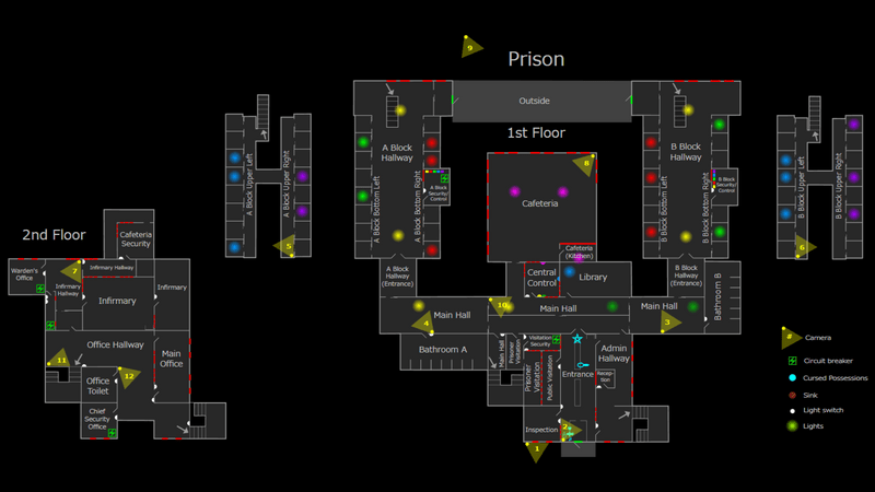 - ハント時に出入口のドアに加え、両フロアの廊下に続く4か所のドアもロックされ、ハント終了までプレイヤーはそこを行き来することができなくなります。なおゴーストは通り抜けることが可能なので注意してください。