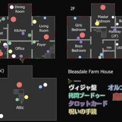 124年まえ ID:fo2retbiBleasdale Farmhouseのマップにて、ウィジャ盤が1Fのガレージ右側の壁の机に置いてあるところを確認しました。
