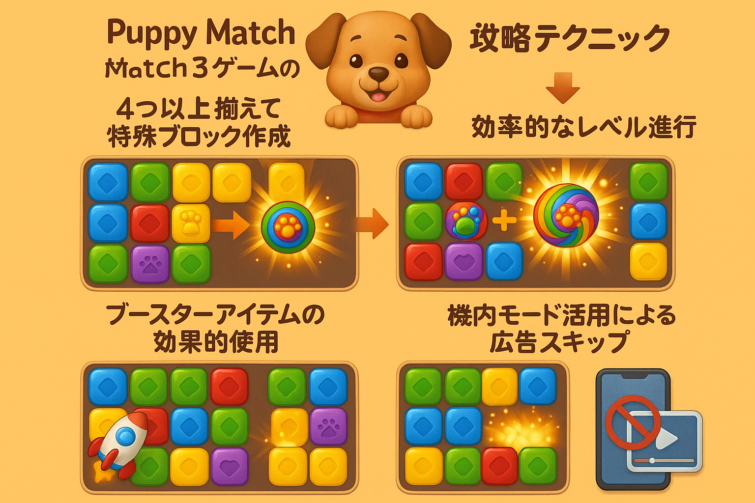 Puppy Match : Match 3 Gameでアメフリポイントを効率的に獲得するには、機内モード活用による広告スキップ と レベル3000を現実的目標にした計画プレイ が重要です。