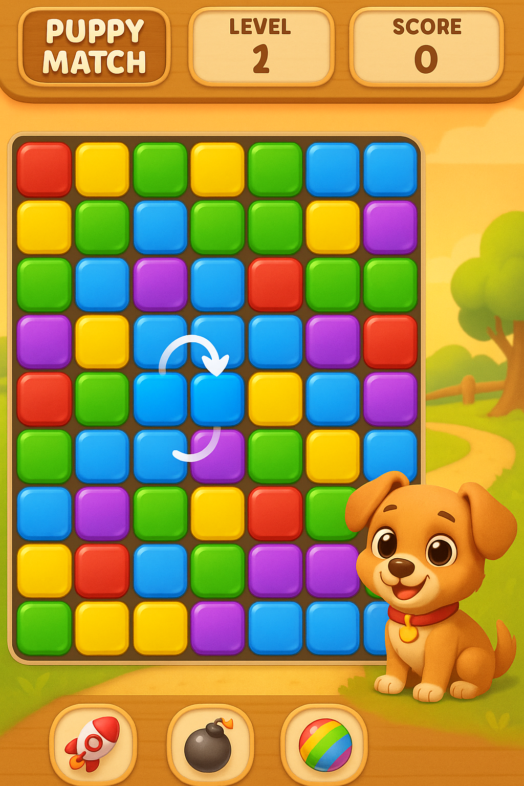 - 4つ以上揃えて特殊ブロック作成: 同色ブロック4つ以上で特殊ブロック生成(ロケット、爆弾等)