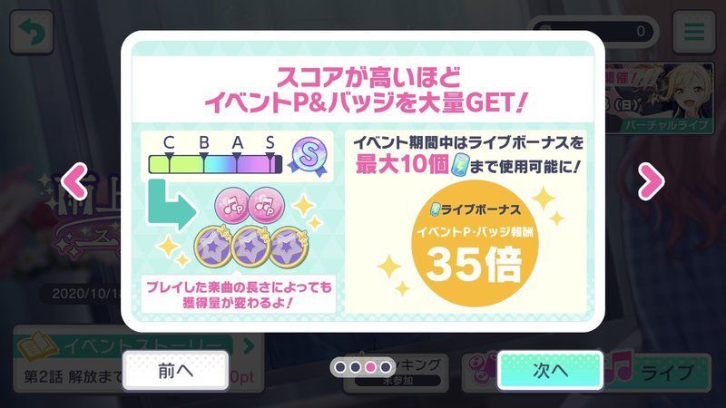 - イベント期間中は最大10個のライブボーナスを使用でき、イベントPとバッジの獲得量が最大で35倍になります。