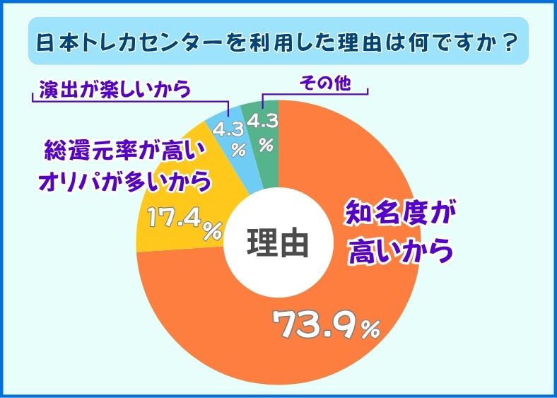 日本トレカセンターを利用した理由で最も多かった回答は、「知名度が高いから」で、全体の約74%(17名)を占めました。