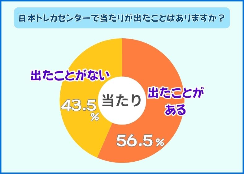 日本トレカセンターの当選確率の調査では、当たりが「出たことがある」と回答した方は全体の約56%(13名)で、半数以上を占めました。