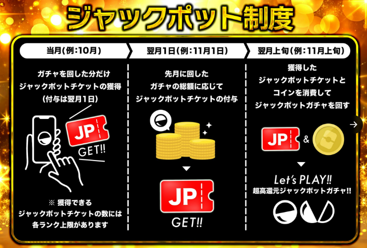 通常ガチャは誰でもいつでも楽しめる一方、ジャックポットガチャはブロンズランク以上のユーザー限定で毎月上旬にのみ開催される特別イなベントです。