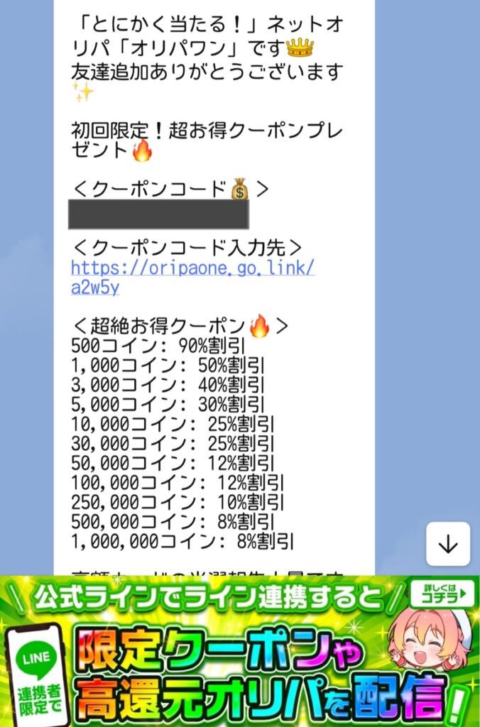 「ガッツリとオリパワンを楽しみたい」と決めている方は、この初回限定のLINEクーポンは大変お得ですので、ぜひ活用してください。
