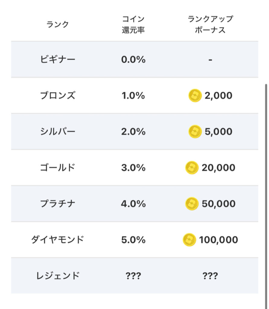 ランクに応じて、招待コードの発行以外にもコイン還元率がアップしたり、ボーナスコインの付与などがあります。
