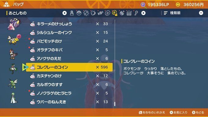 現在所持しているコレクレーコインは「メニュー」→「バック」→「おとしもの」から確認できます。
