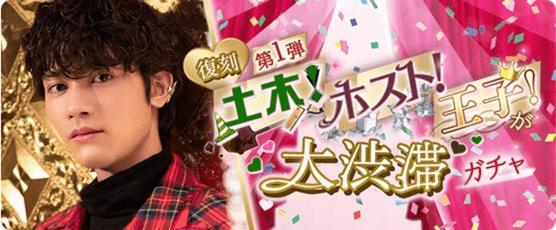 | ★3【 貴族誕生EP0 】伊集院 信虎、★2【 貴族誕生EP0 】京極 竜、★2【 貴族誕生EP0 】ヤスが期間限定で登場するガチャです。 期間限定カードには、カードストーリーだけでなく、特別なムービーが付いています。 10連ガチャの4回目、7回目、10回目は新★2以上が1枚確定となります。 10連を引く毎に『 復刻 土木!ホスト!王子!が大渋滞!ガチャ第1弾メダル 』×1枚を獲得できます。『 復刻 土木!ホスト!王子!が大渋滞!ガチャ第1弾メダル 』を一定数集めることで、交換所でカードやアイテムと交換することができます。 |