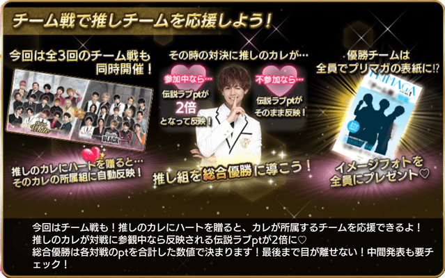 全3回あるチーム戦で推しの彼が対戦に参戦中ならチームに反映される伝説ラブptが2倍♡