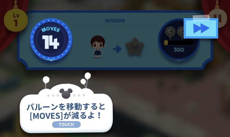 ▲バルーンを1回動かすと、MOVE(手数)が1つずつ減ります。MOVEが全て無くなる前にクリアしましょう。