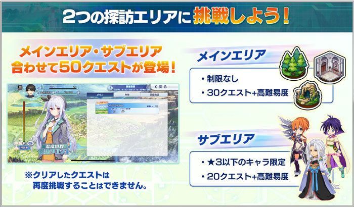 | 本イベントは、編成制限なしのメインエリアと編成制限ありのサブエリアの二つのエリアの探訪を行い、全エリア制覇を目指す踏破形式のイベントです。 全エリア制覇を目指してクエストに挑戦してみてください。 |