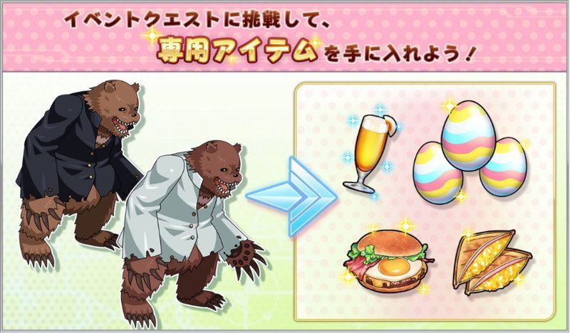 | 本イベントでは、イベント限定ストーリーが繰り広げられる「メインクエスト」、ドロップ報酬でイベント専用アイテムを集めることができる「フリークエスト」を楽しむことができます。 更に、イベント後半ではもう一つのイベントポイントが獲得できる「後半フリークエスト」、強敵と戦うことができる「高難易度クエスト」が追加されます。 |