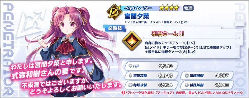 | 夕菜 | 186,500 | CRT威力アップ【解除不能】 物攻アップ【解除不能】 |