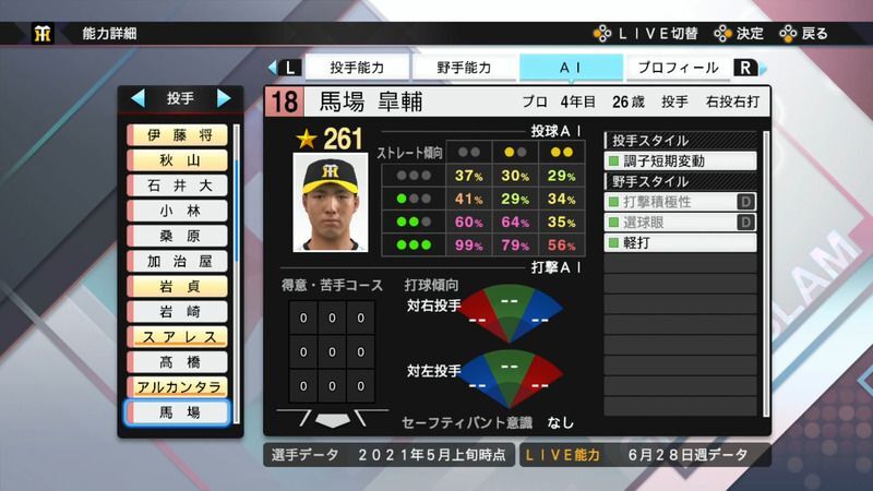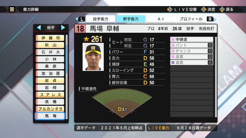 プロスピ2021(プロ野球スピリッツ2021)の馬場 皐輔の実在選手データです。能力、基本ステータス、特殊能力などの選手データをまとめています。