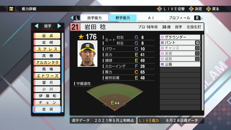 プロスピ2021(プロ野球スピリッツ2021)の岩田 稔の実在選手データです。能力、基本ステータス、特殊能力などの選手データをまとめています。