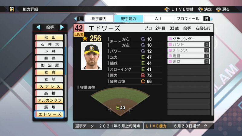 | 変化量 球威 制球 | B E | 1 E E | 3 E E | 4 D E | ||