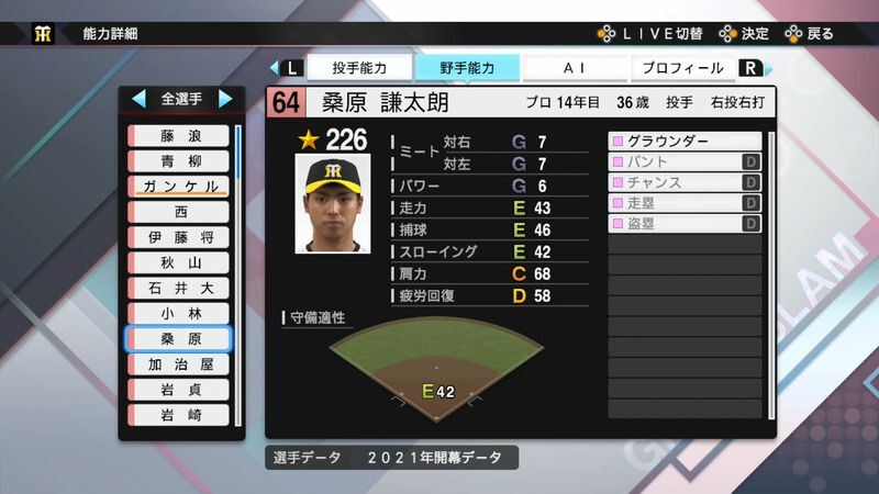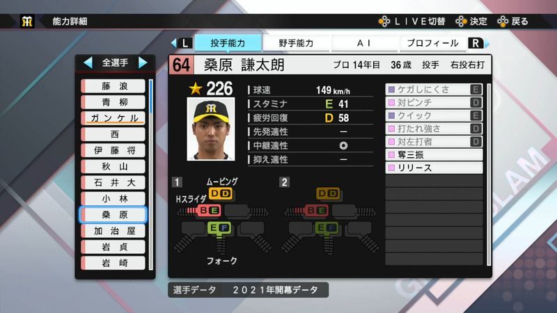 | 変化量 球威 制球 | D D | 4 B E | 2 E F | |||