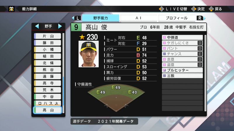 プロスピ2021(プロ野球スピリッツ2021)の髙山 俊の実在選手データです。能力、基本ステータス、特殊能力などの選手データをまとめています。