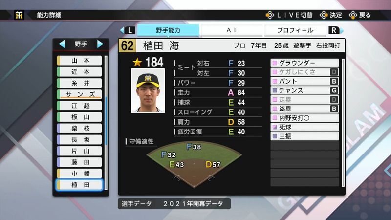プロスピ2021(プロ野球スピリッツ2021)の植田 海の実在選手データです。能力、基本ステータス、特殊能力などの選手データをまとめています。