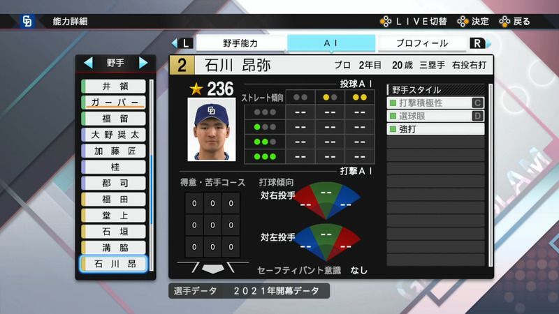 プロスピ2021(プロ野球スピリッツ2021)の石川 昂弥の実在選手データです。能力、基本ステータス、特殊能力などの選手データをまとめています。