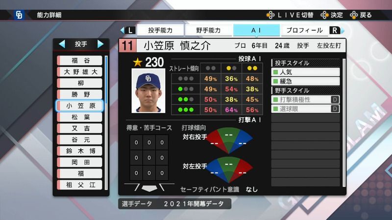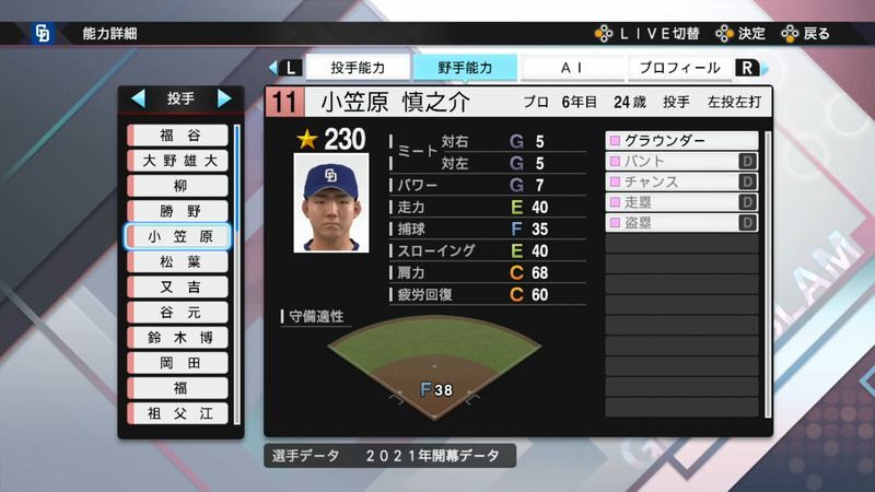 プロスピ2021(プロ野球スピリッツ2021)の小笠原 慎之介の実在選手データです。能力、基本ステータス、特殊能力などの選手データをまとめています。