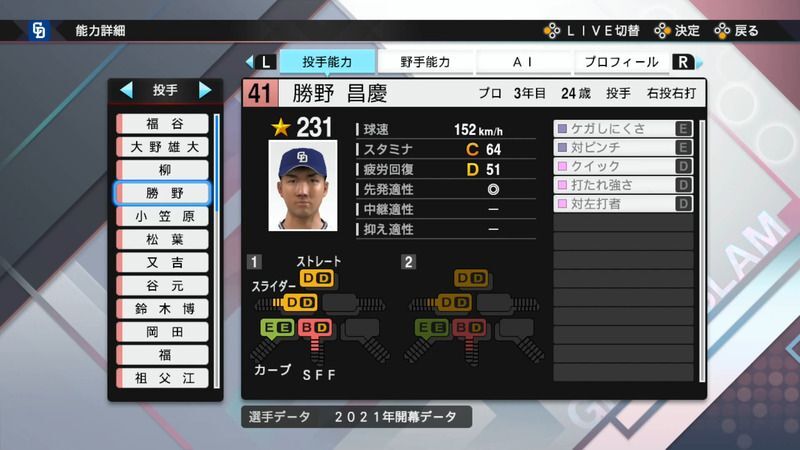 【プロスピ2021】勝野 昌慶選手の能力