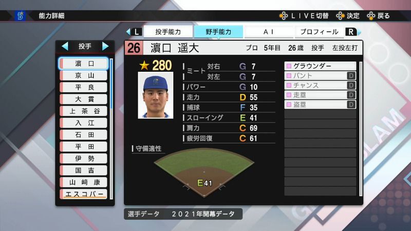 | 変化量 球威 制球 | D F | 4 B F | 2 E F | |||