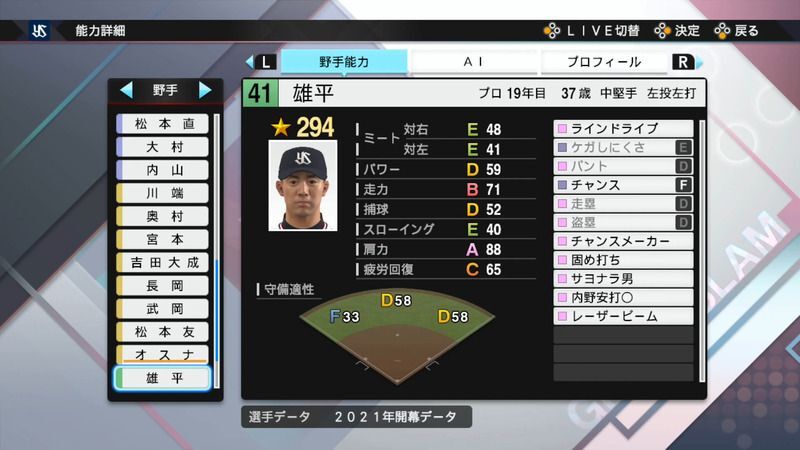 プロスピ2021 雄平の選手能力