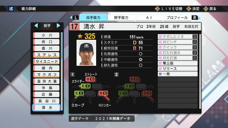【プロスピ2021】清水 昇選手の能力