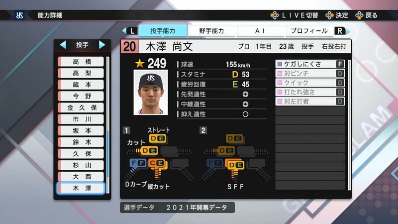 プロスピ2021 木澤 尚文の選手能力
