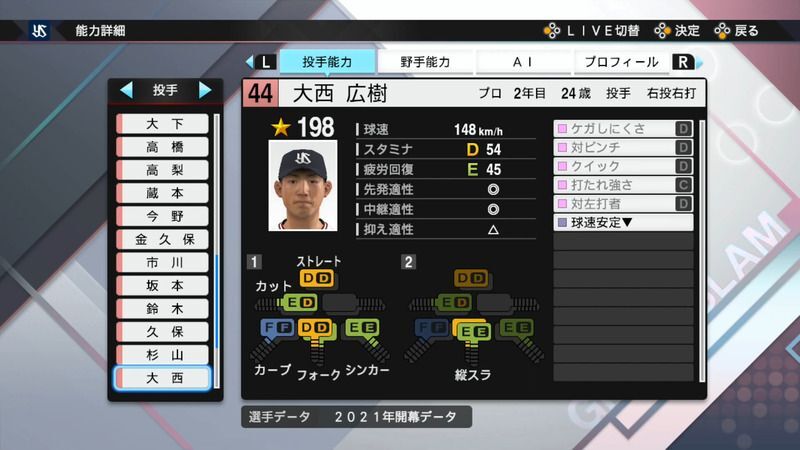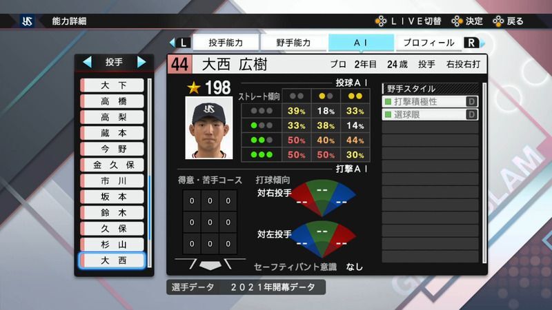 プロスピ2021(プロ野球スピリッツ2021)の大西 広樹の実在選手データです。能力、基本ステータス、特殊能力などの選手データをまとめています。