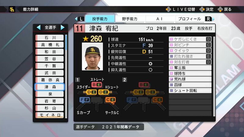 | 変化量 球威 制球 | B E | 3 D E | 1 F F | 2 C E | 3 D E | |