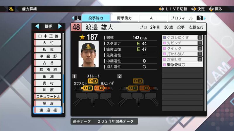 | 変化量 球威 制球 | D D | 2 D E | 5 C D | |||
