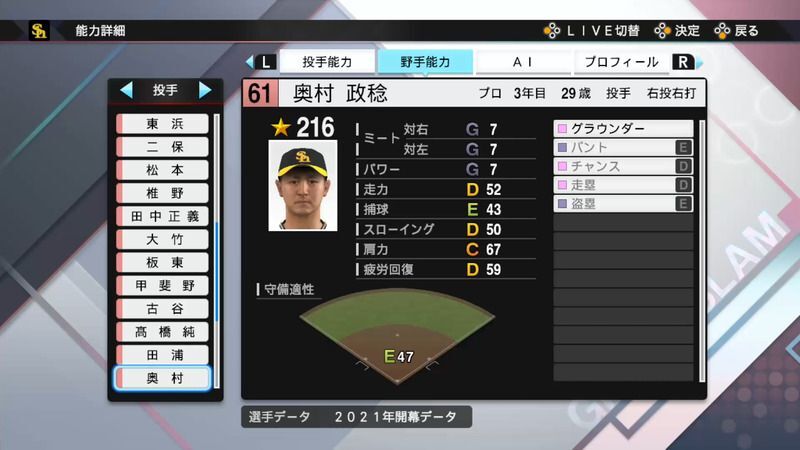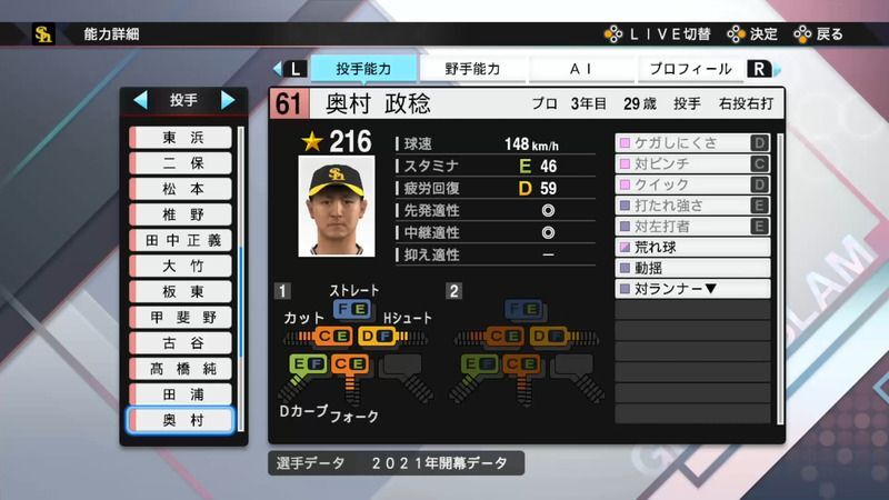 【プロスピ2021】奥村 政稔選手の能力