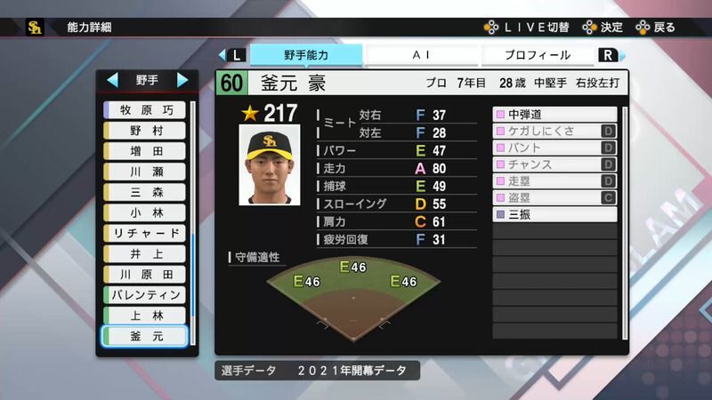 プロスピ2021(プロ野球スピリッツ2021)の釜元 豪の実在選手データです。能力、基本ステータス、特殊能力などの選手データをまとめています。